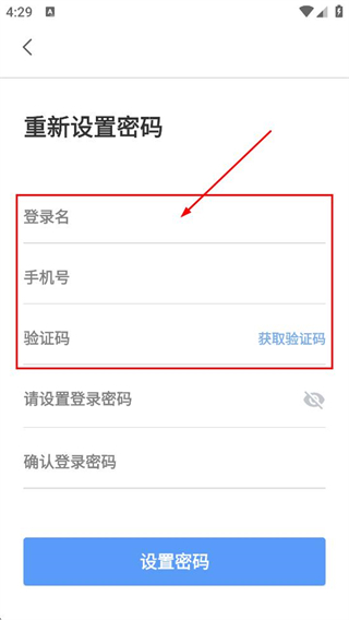 3、在重新设置密码页,填写请设置登录密码与确认登录密码,点击设置密码,完成密码重置。