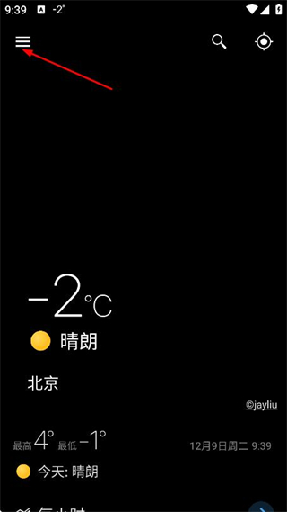 1、在天气首页点击左上角的菜单按钮,进入菜单页面。