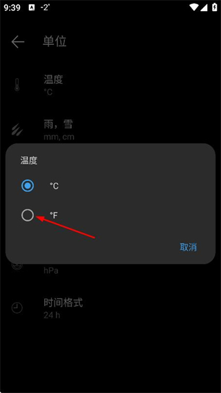 5、在温度单位选择框中点击目标选项,完成温度单位的切换操作。