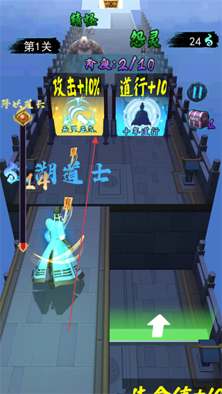 1、击败敌人后选择道行+10增益,提升角色属性,继续推进第1关进程。