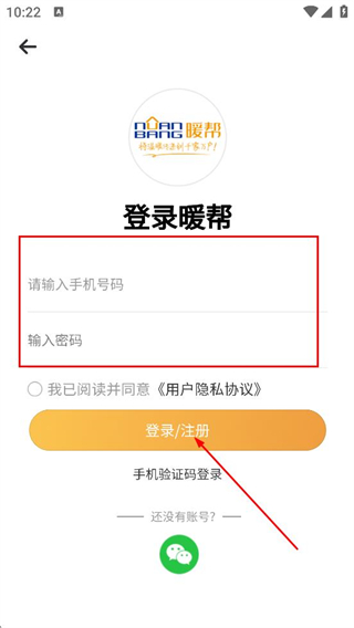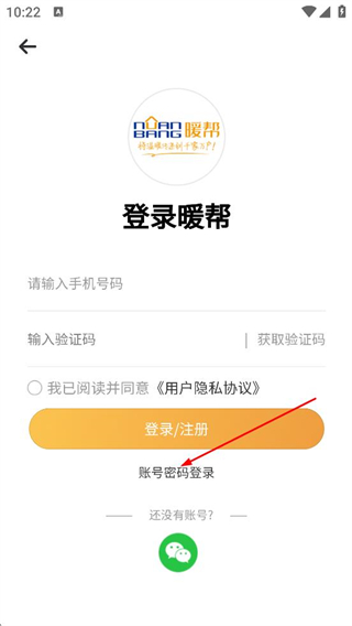 3、在登录暖帮页面,点击账号密码登录,切换至账号密码登录界面。