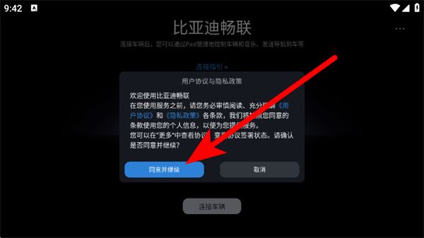 1、打开比亚迪畅联,在提示框,点击同意并继续,进入主界面。