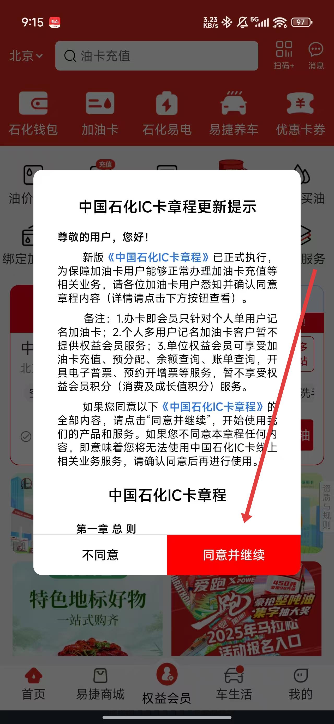 2、点击充值按钮,出现IC卡章程更新提示,点击同意并继续按钮进入下一步骤。