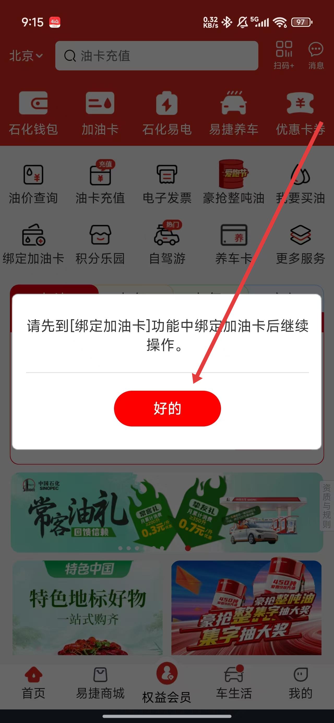 3、若还为绑定加油卡,点击好的按钮,跳转到绑定页面完成后即可执行充值。