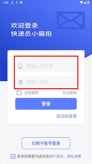 2、在密码登录界面,依次在手机号和密码输入框中填写对应信息。