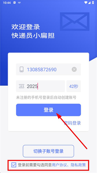 2、勾选同意用户协议和隐私政策后,点击登录选项。