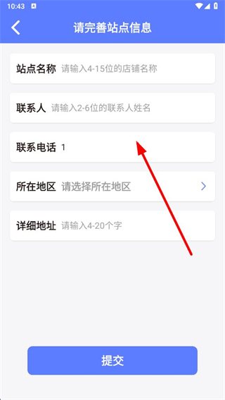 3、登录后进入完善站点信息页面,填写信息,点击提交按钮,完成注册流程。