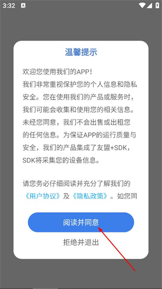 1、在温馨提示弹窗中,点击阅读并同意,进入羽毛球APP首页。