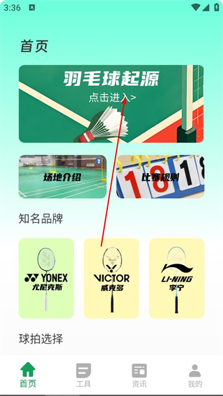 2、在首页,点击羽毛球起源,点击进入板块,进入对应的课程页面。