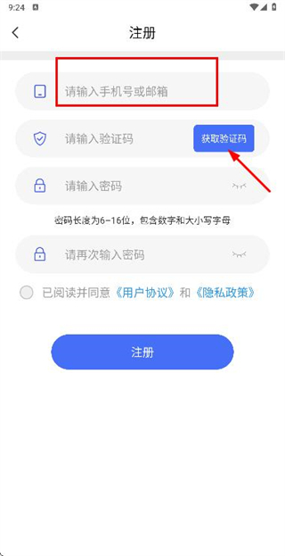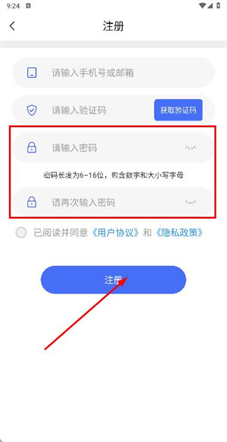 3、在注册账号页面填写验证码和密码,勾选协议后点击注册完成账号注册操作。