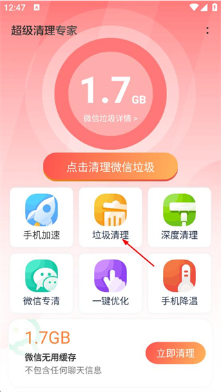 3、在清理完成页面,可点击微信专清对应的立即清理,清理无用缓存。