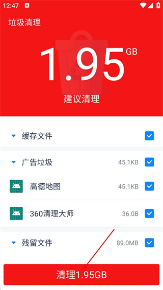 2、在垃圾清理页面,点击清理1.95GB的按钮,执行垃圾清理操作。