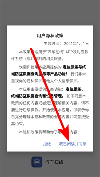 1、打开谷米汽车在线,在弹窗中,点击我已阅读并同意。