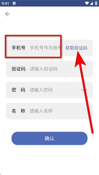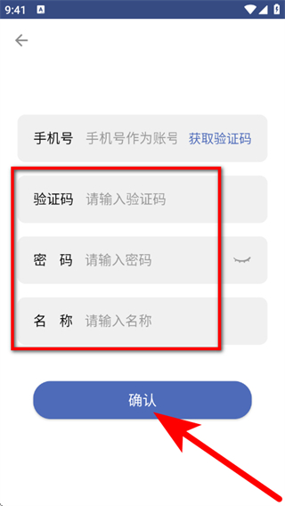 4、输入验证码、设置密码、填写名称后,点击确认,完成注册。