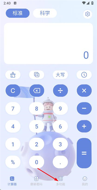 1、在计算器主界面点击底部的多功能选项,进入多功能页面。