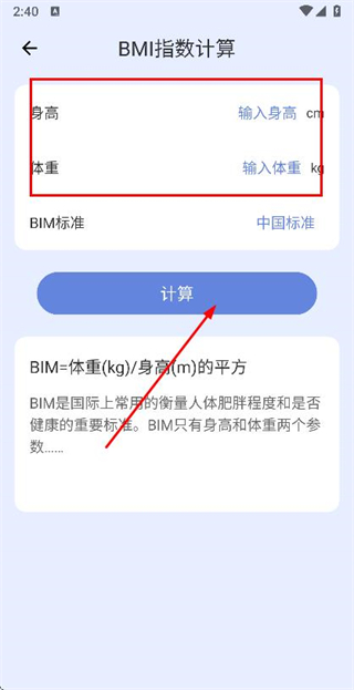 3、在BMI指数计算页面填写身高和体重信息后,点击计算按钮完成BMI指数的计算操作。
