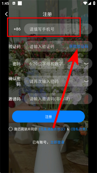 3、在注册页面,输入填写手机号,点击获取验证码。