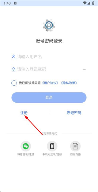 2、在账号密码登录页面点击注册选项,进入注册页面。