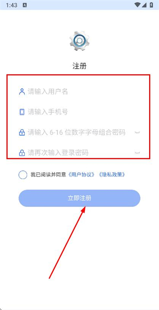 3、在注册页面填写所需信息并勾选协议后,点击立即注册按钮完成注册操作。