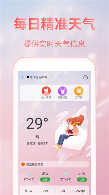 美人天气app是全新的查看天气的软件,可查看国内外多个城市的天气预报、空气质量等,方便人们出行,数据精准,温馨提示用户加减衣服,界面清新,非常适合小女生,画面唯美,快来这里点击下载体验看看吧!