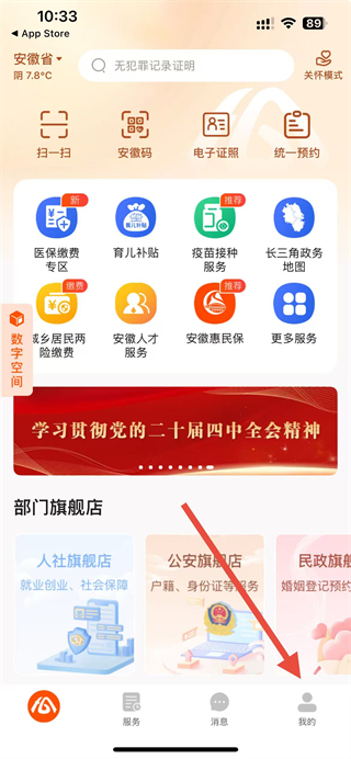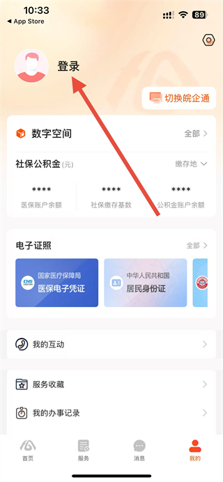 1、打开皖事通app,在界面底部点击我的,进入我的个人页面。