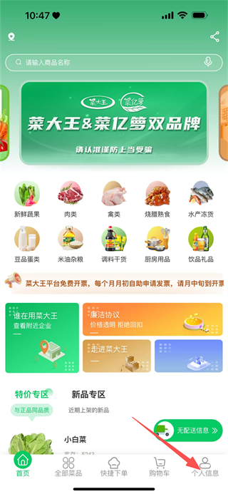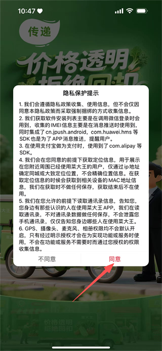 1、在菜大王的隐私保护提示弹窗中,点击同意,进入应用首页。