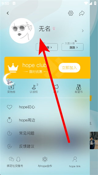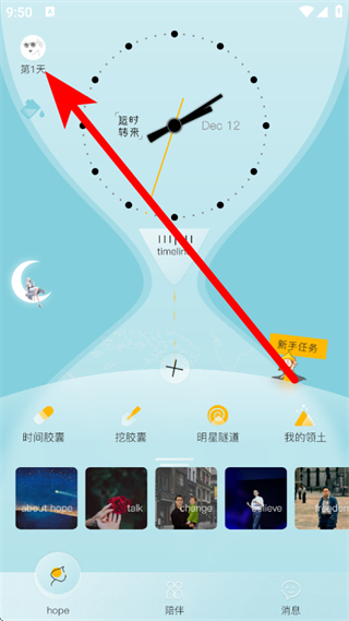 1、打开hope时间胶囊,点击页面左上角的头像,进入个人页面。