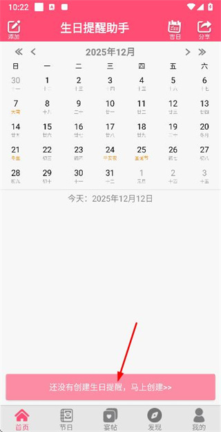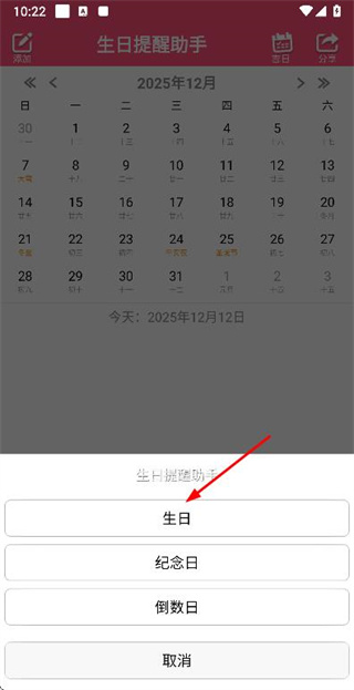 2、在创建类型选择窗口中点击生日选项,进入新增生日页面。