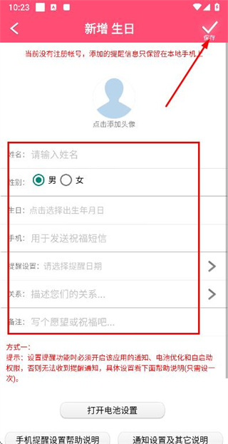 3、在新增生日页面填写所需信息后,点击右上角的保存按钮,完成生日提醒的创建操作。