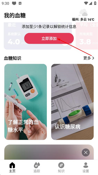 2、在应用首页,点击立即添加的按钮,进入血糖新记录的编辑页面。