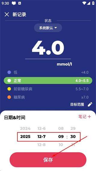 3、在新记录页面,选定对应日期时间后,点击保存,完成血糖记录的添加。