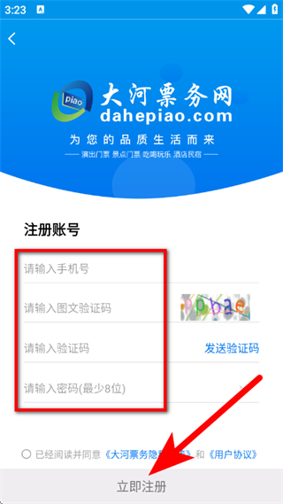 5、填入验证码、设置密码后,勾选协议,点击立即注册,完成账号注册。