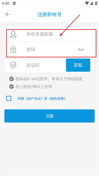 2、在注册新帐号页面,填写手机号或邮箱密码,进行下一步的操作。