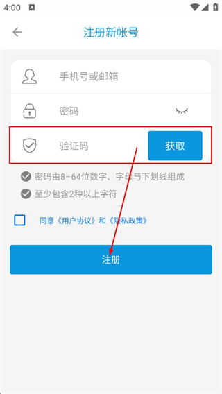 3、在该注册页面,填写验证码对应的内容后,点击注册,完成账号注册。