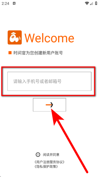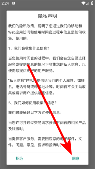 1、打开时间官,在隐私声明弹窗中,点击同意。