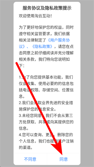 1、打开淘云互动,在服务协议与隐私政策提示弹窗中,点击同意。