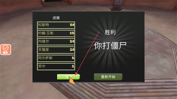 4、战斗胜利后显示你打僵尸的进度界面,点击继续按钮,推进后续游戏流程。