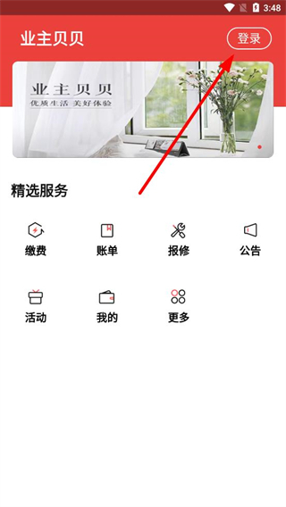 1、打开业主贝贝APP后,找到页面右上角的登录按钮并点击,进入登录界面。