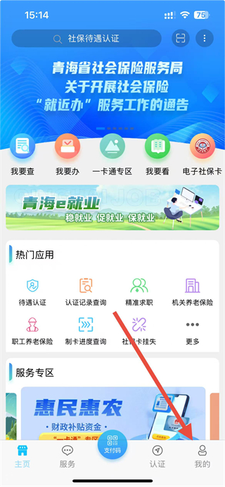 1、打开青海人社通APP后,找到页面底部我的选项并点击,进入我的界面。