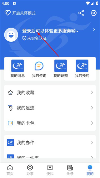 3、在个人页面中,点击登录后可以体验更多服务哟的区域,进入登录页面。