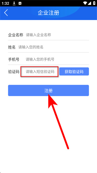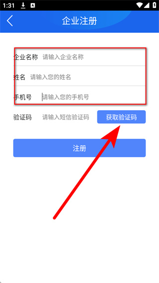 3、在企业注册页面,依次填写对应的信息,点击获取验证码。