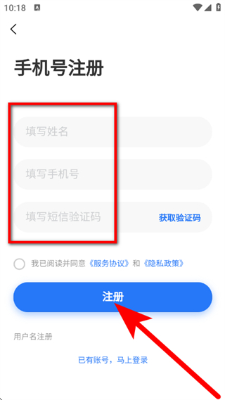 4、在注册页面,输入手机号并获取填写短信验证码,勾选协议,点击注册,完成注册。
