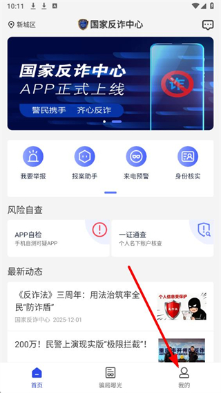 1、打开国家反诈中心app,点击底部我的选项,进入个人界面。