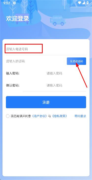 2、在注册账号页面填写手机号码后,点击发送验证码。