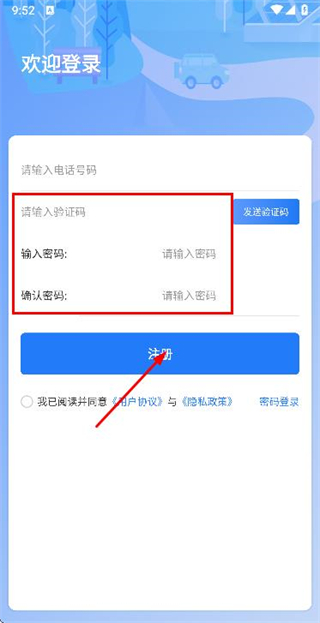 3、在注册账号页面填写验证码和密码,勾选协议后点击注册完成账号注册操作。