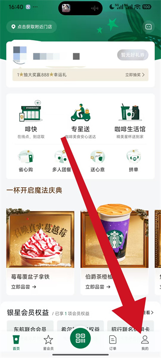 1、打开星巴克,点击底部导航栏的我的,进入个人页面。