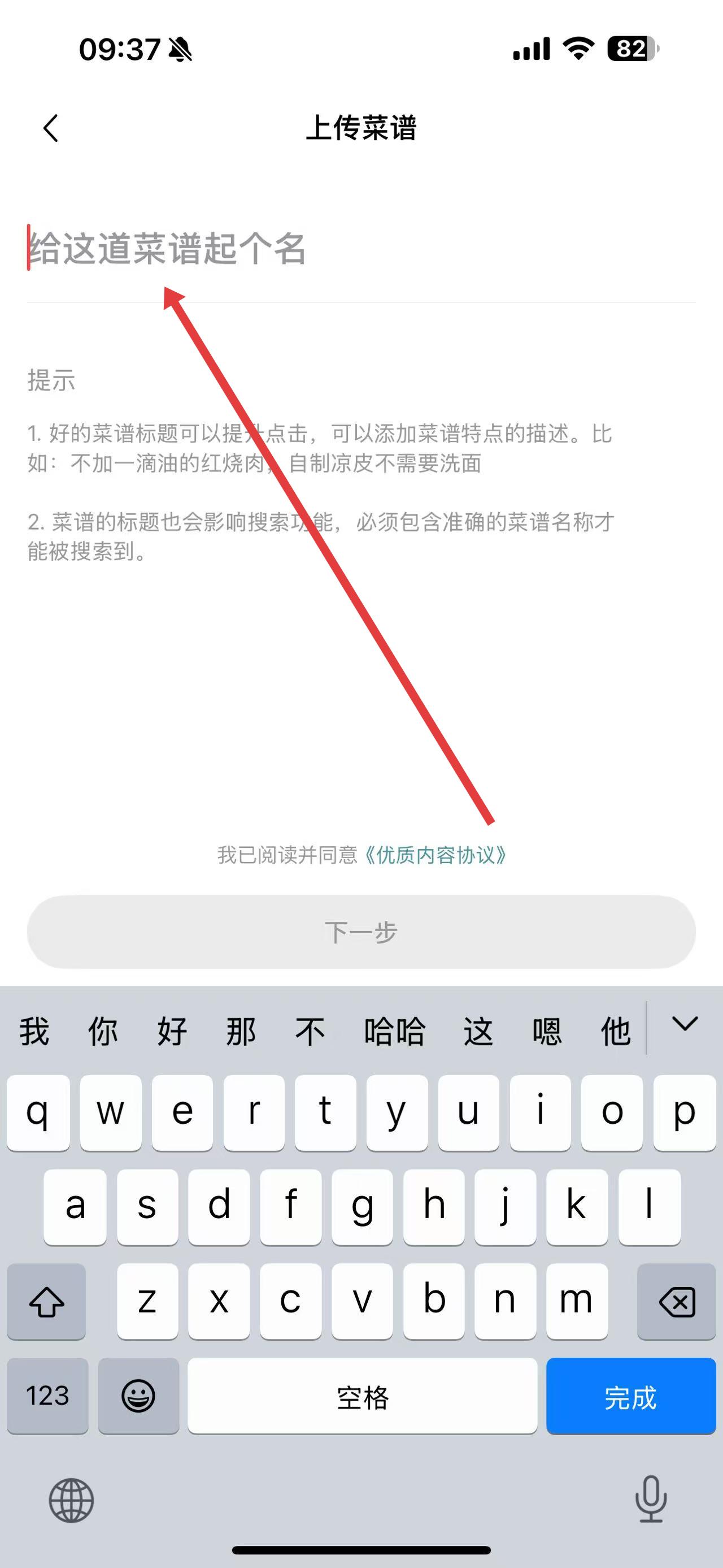 3、在上传菜谱界面,首先在顶部输入框给这道菜谱起个名,为你的菜谱取一个合适的标题。