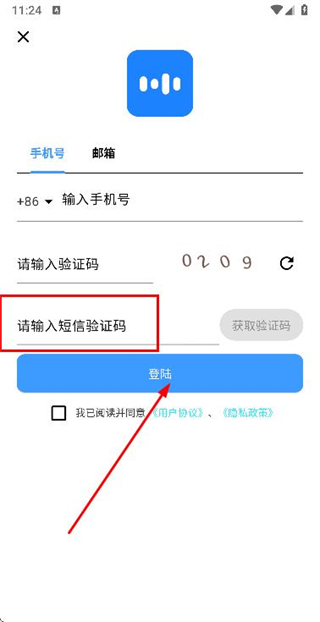3、在验证码输入框中填写收到的验证码,点击登录完成账号的登录操作。