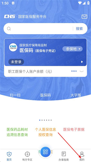 1、在国家医保服务平台首页,点击底部我的,进入登录页面。