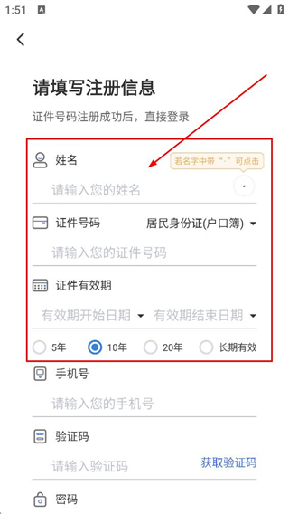 3、在注册信息页面,填写姓名、证件号码等带*的注册信息。